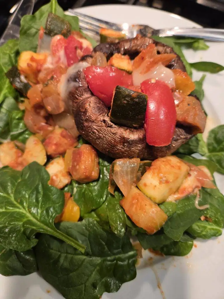 Portobello Ratatouille Salad is delicious roasted vegetables stuffed inside a portobello on top of leafy greens.