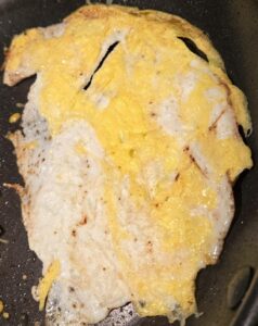 - Once the egg is set on the bottom (the clear is now white), take a spatula and break the yolk then flip the egg over.