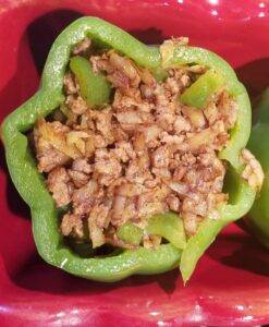 - Add the beef mixture evenly into each pepper.